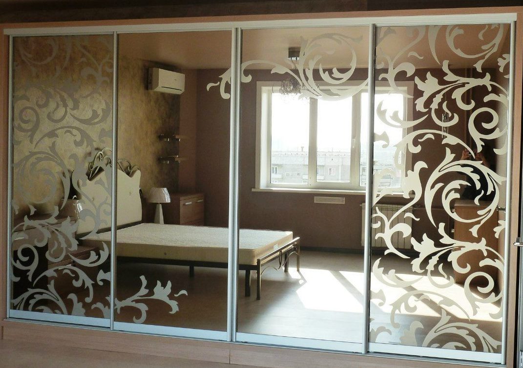 Предлагаем вашему вниманию обычные зеркальные двери  с нанесённым  пескоструйным рисунком  поверх зеркал.